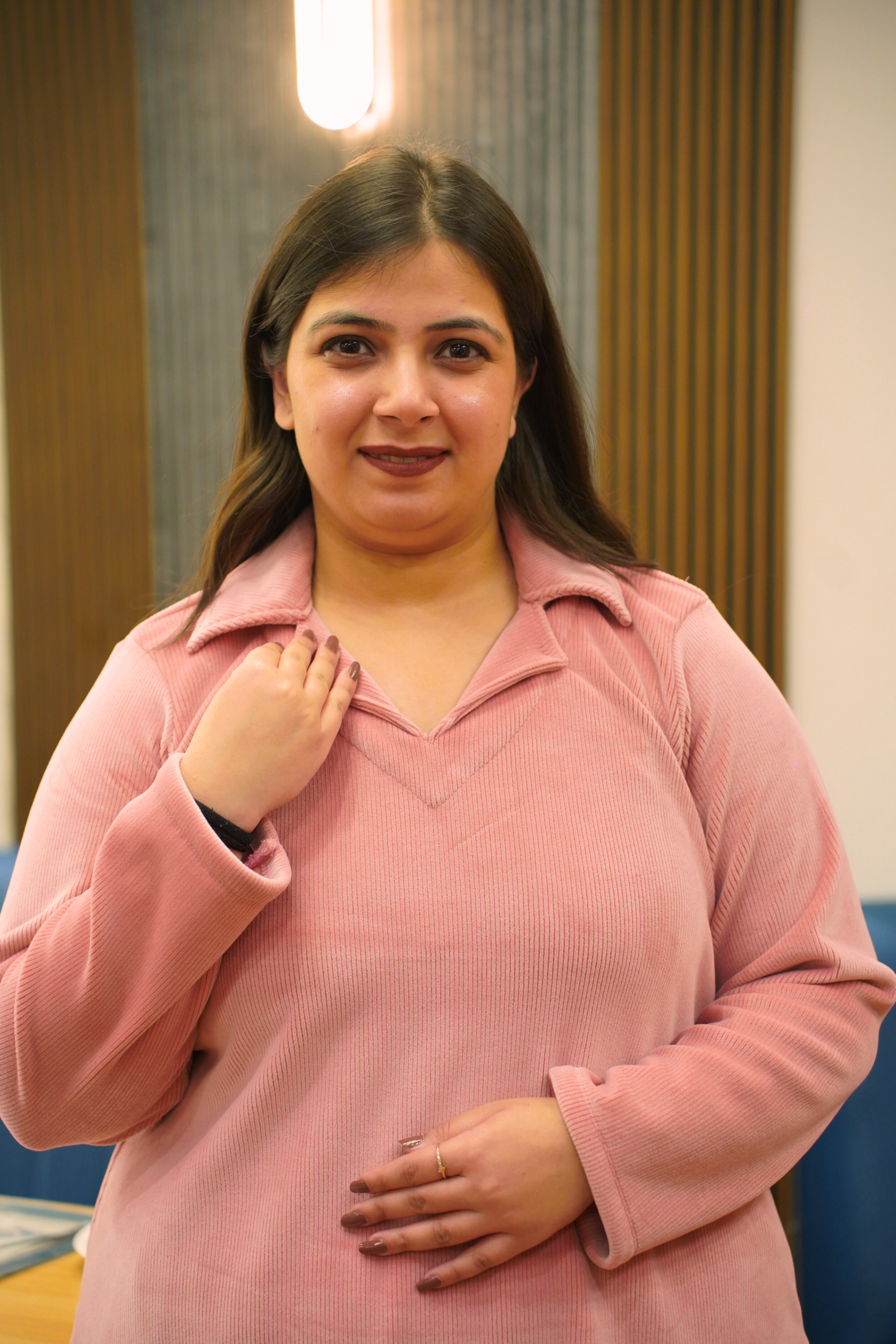 - Features a collar neck for a polished and structured look