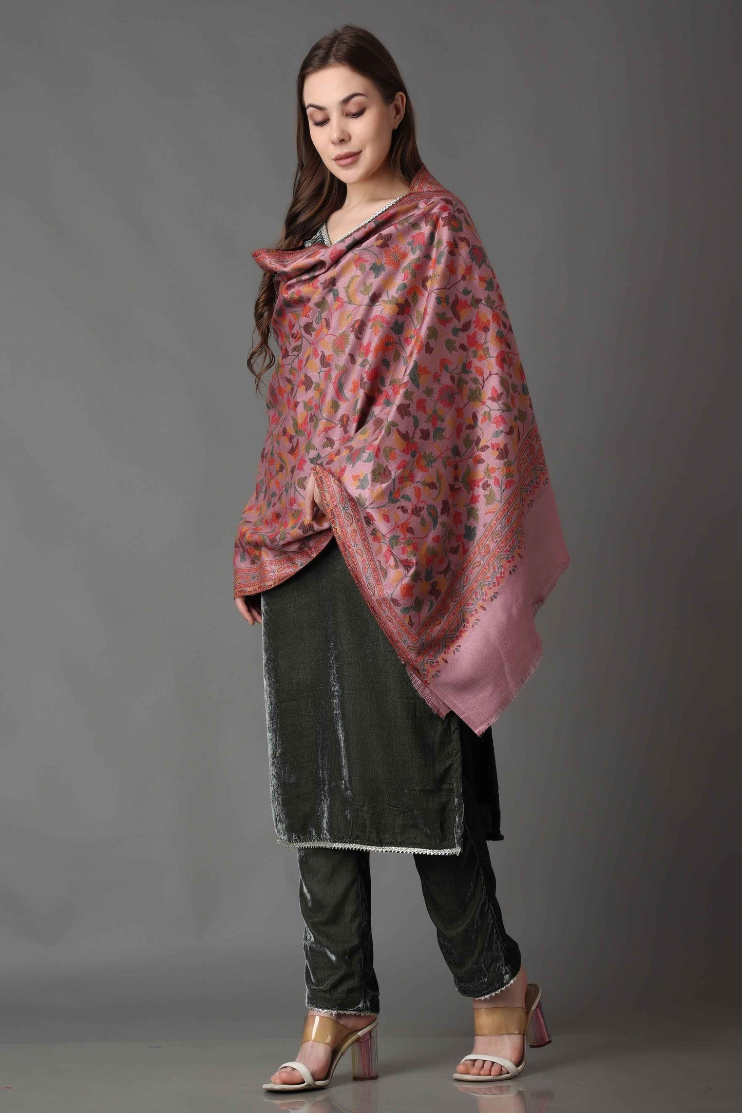 All you need to spice up your look in this Dark Green Suit set in fine Velvet. Featuring minimal lace detailing, this set is sure to accentuate your look when you carry it with Mauve thread woven Pashmina Shawl. Style this elegant piece with stud earrings for a stunning look on any special event.