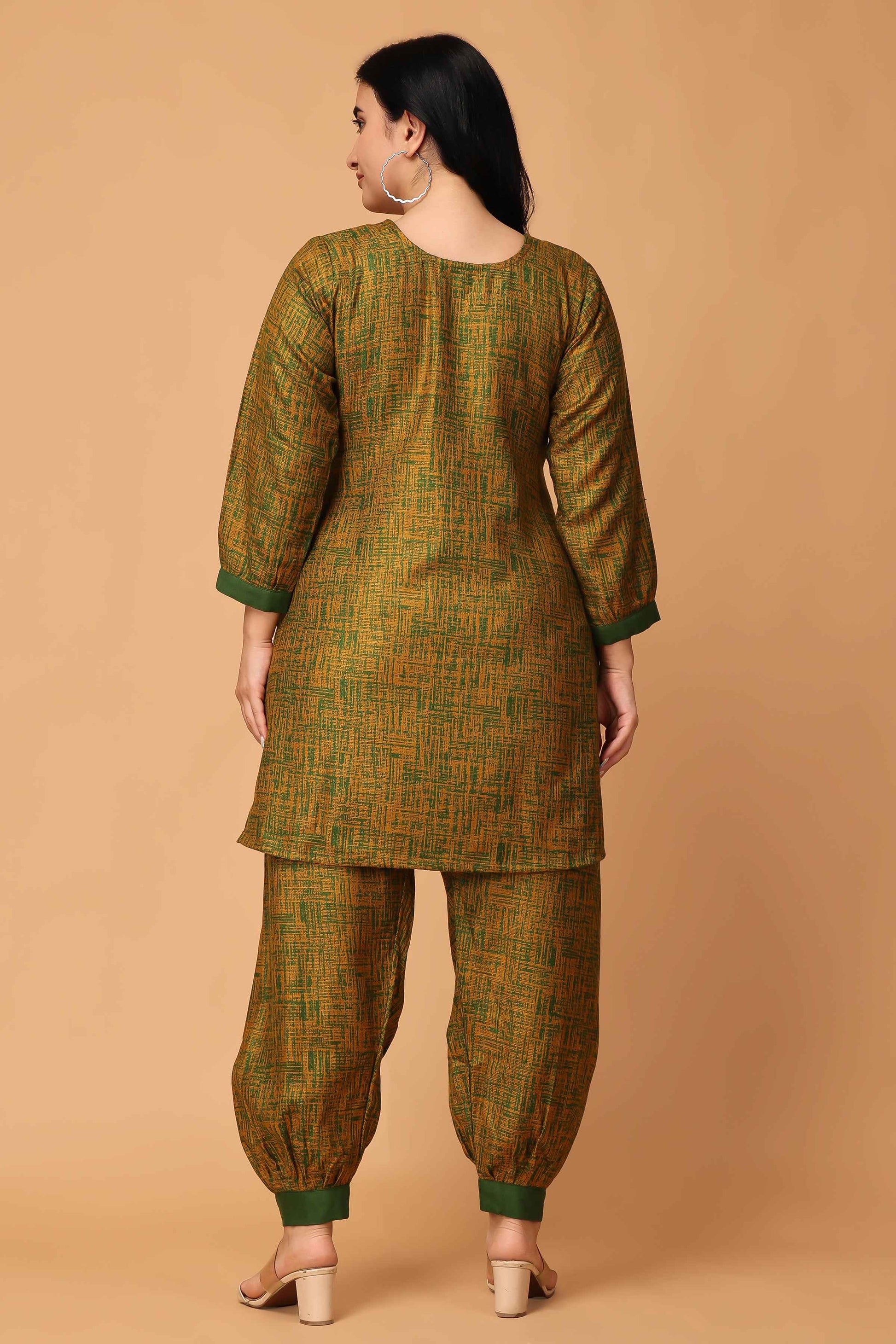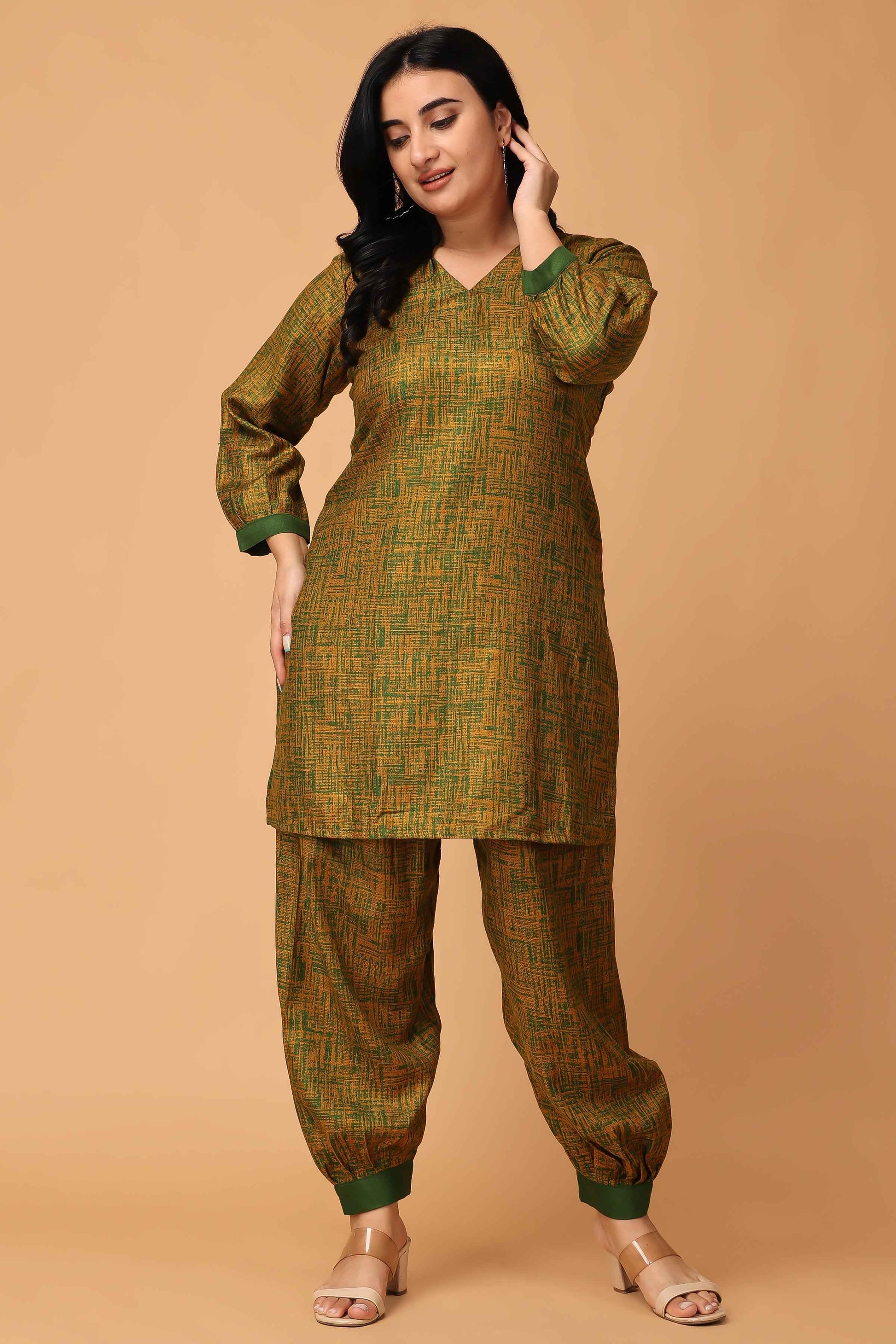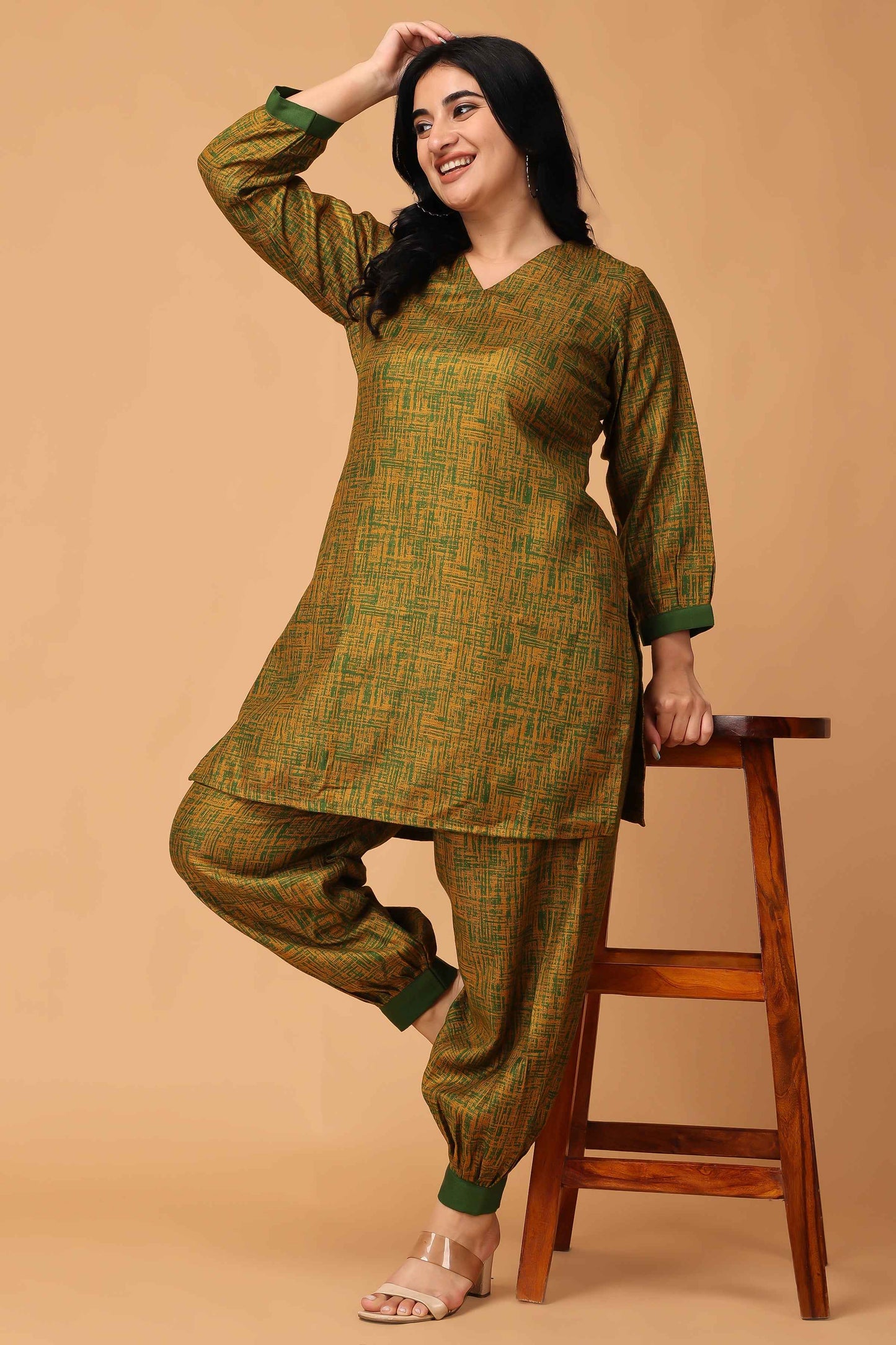Introducing our Green & Mustard Woollen Co-ord Set, a perfect choice for winter elegance. Crafted from the plush comfort of cashmilon fabric, this set features a delightful textured print all over, adding a touch of uniqueness to the rich color. The V-neckline exudes a timeless charm and with full sleeves, it ensures both warmth and style. The matching afghani bottoms make for a perfect companion to the relaxed fit top.