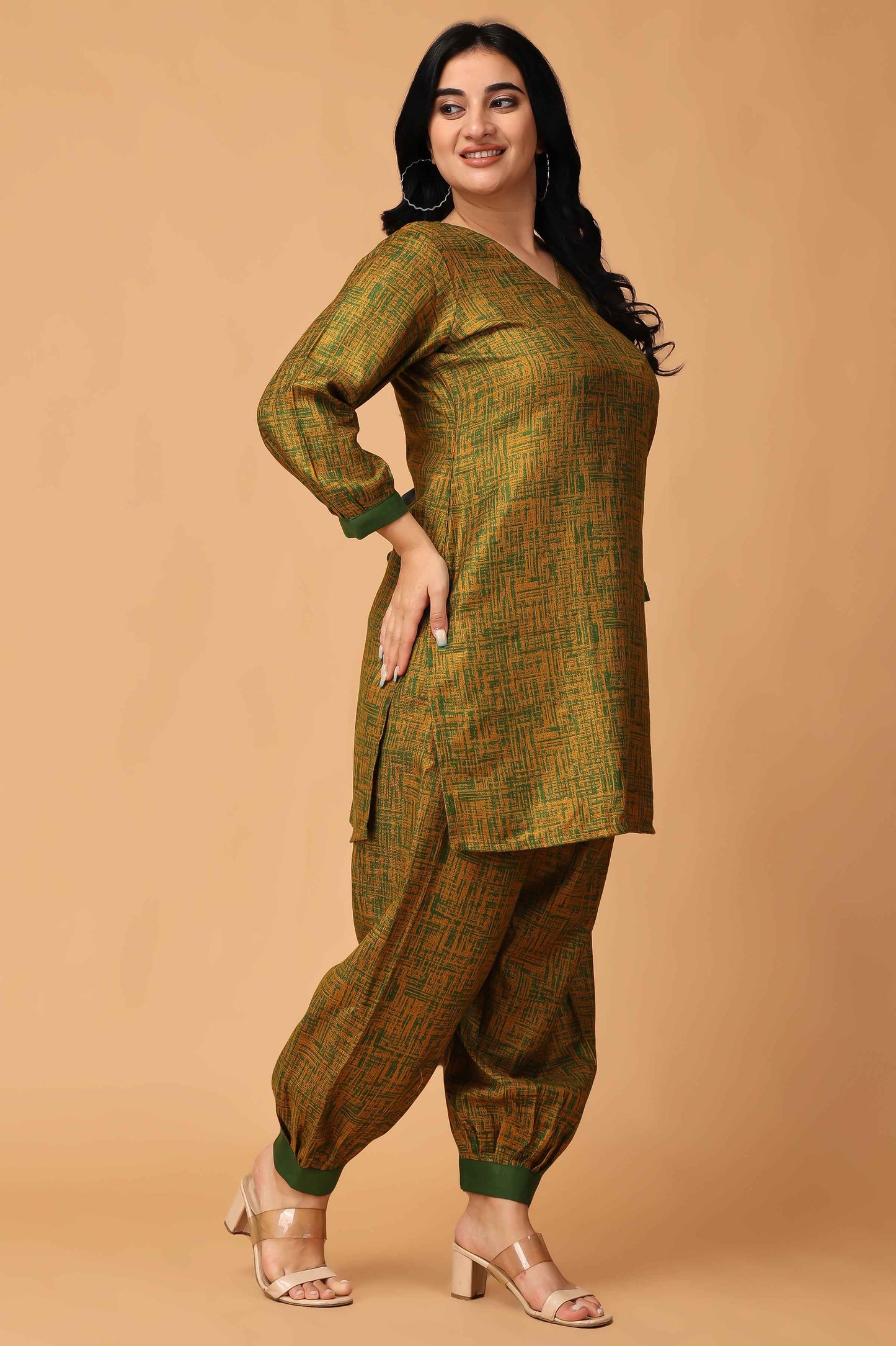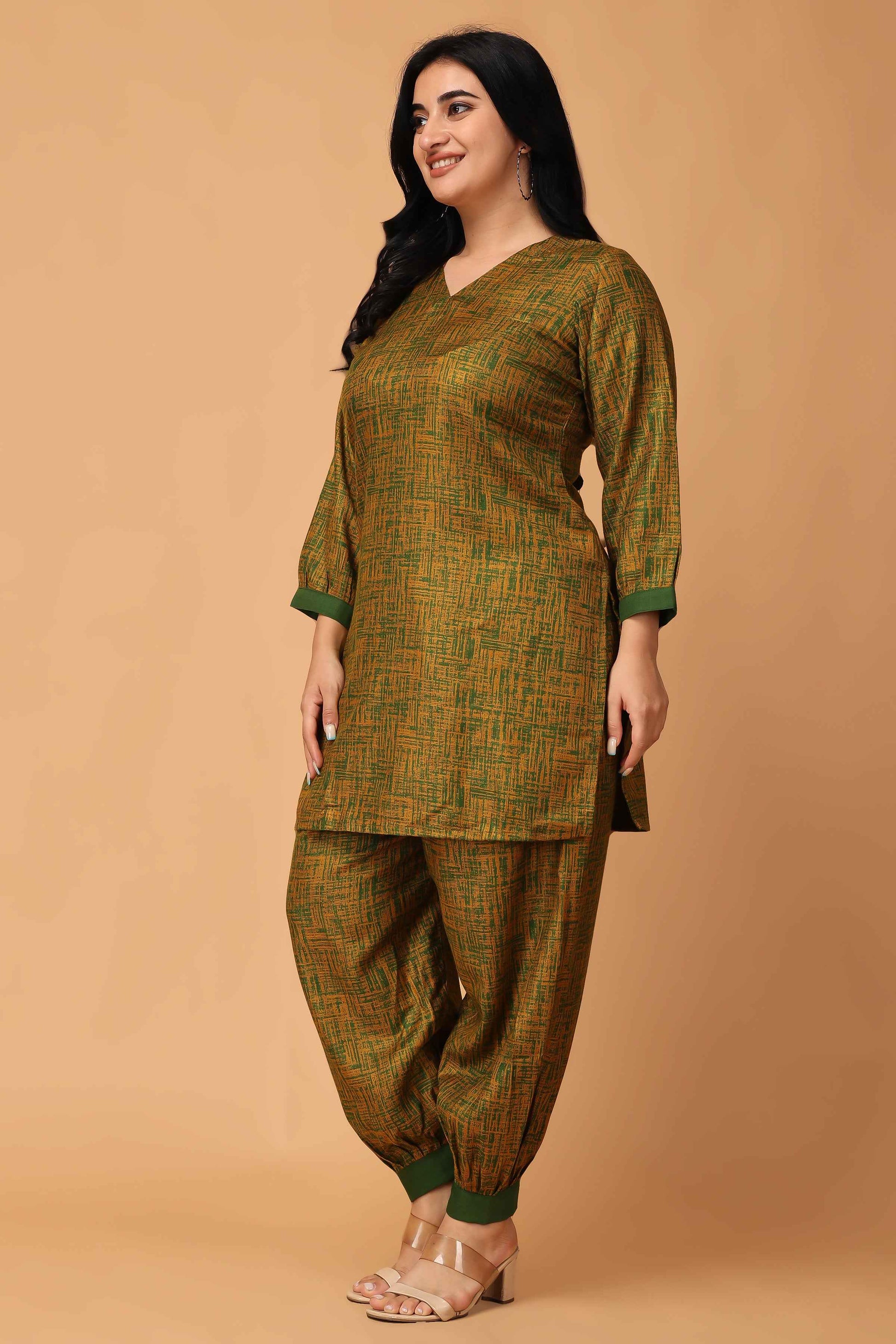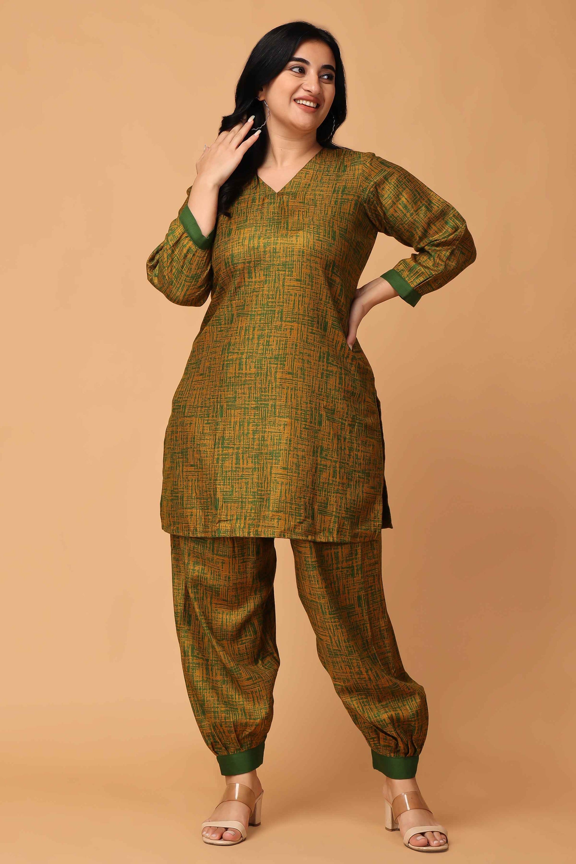 Introducing our Green & Mustard Woollen Co-ord Set, a perfect choice for winter elegance. Crafted from the plush comfort of cashmilon fabric, this set features a delightful textured print all over, adding a touch of uniqueness to the rich color. The V-neckline exudes a timeless charm and with full sleeves, it ensures both warmth and style. The matching afghani bottoms make for a perfect companion to the relaxed fit top.
