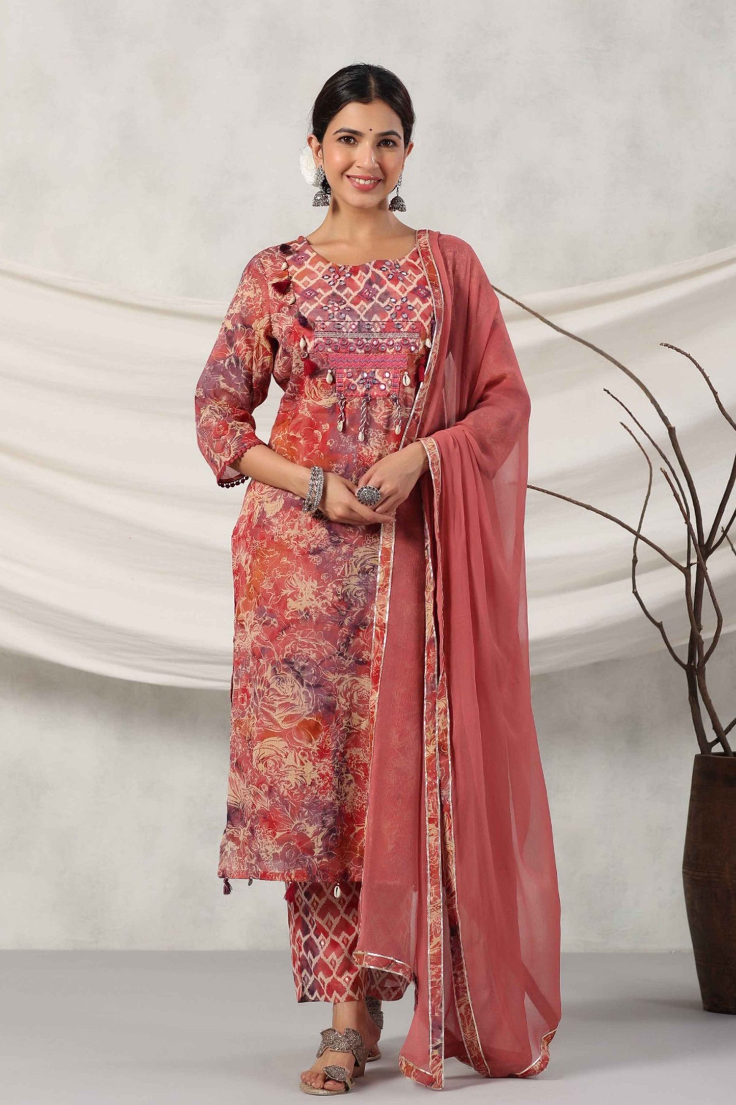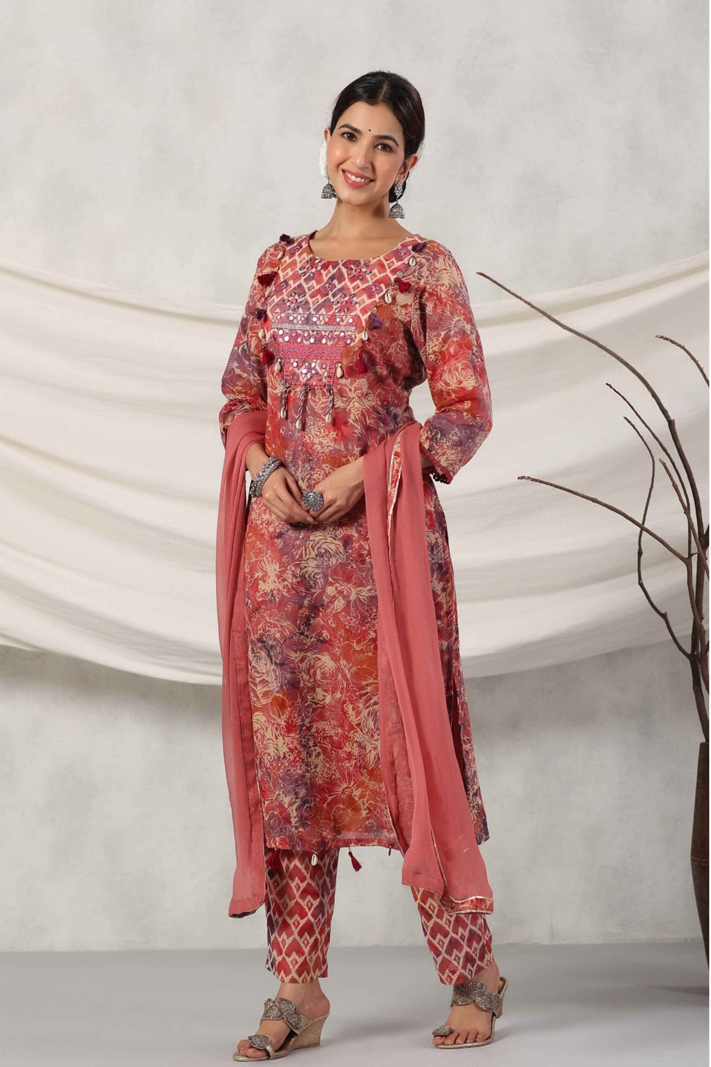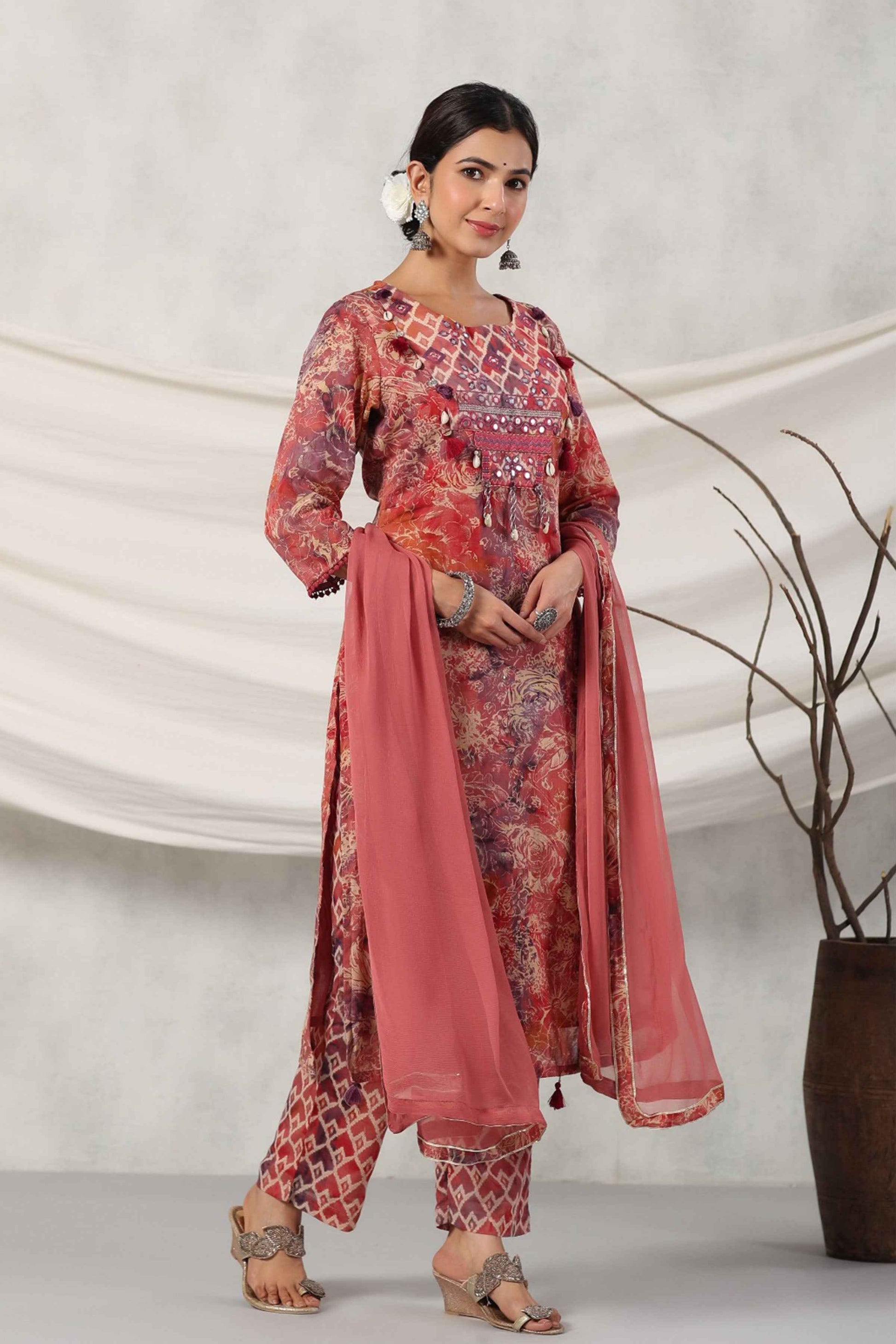 Embrace elegance with our Terracotta Mirrored Cotton Suit Set. Crafted from cotton fabric with an all-over floral print, it features a round neckline adorned with mirror detailing, decorative with cowrie shells, and tassels, plus quarter sleeves with lace accents. It is paired with matching palazzo pants and a chiffon dupatta with lace detailing, this set is a perfect blend of tradition and style.