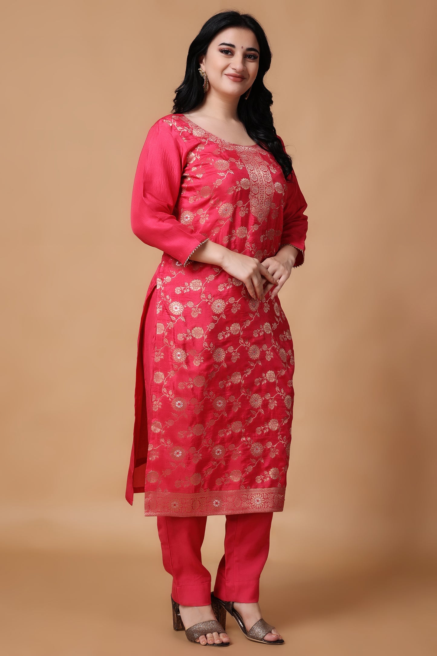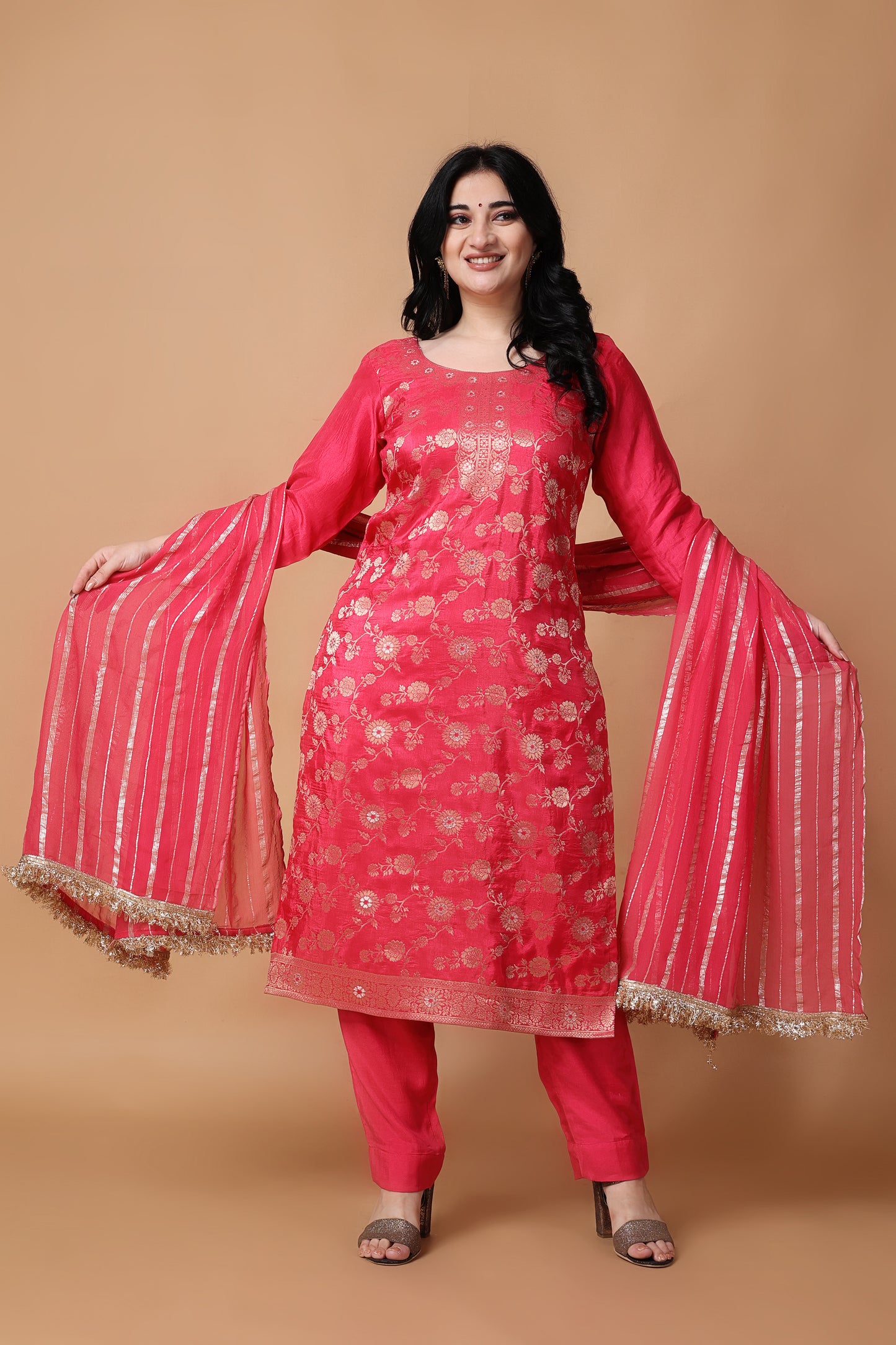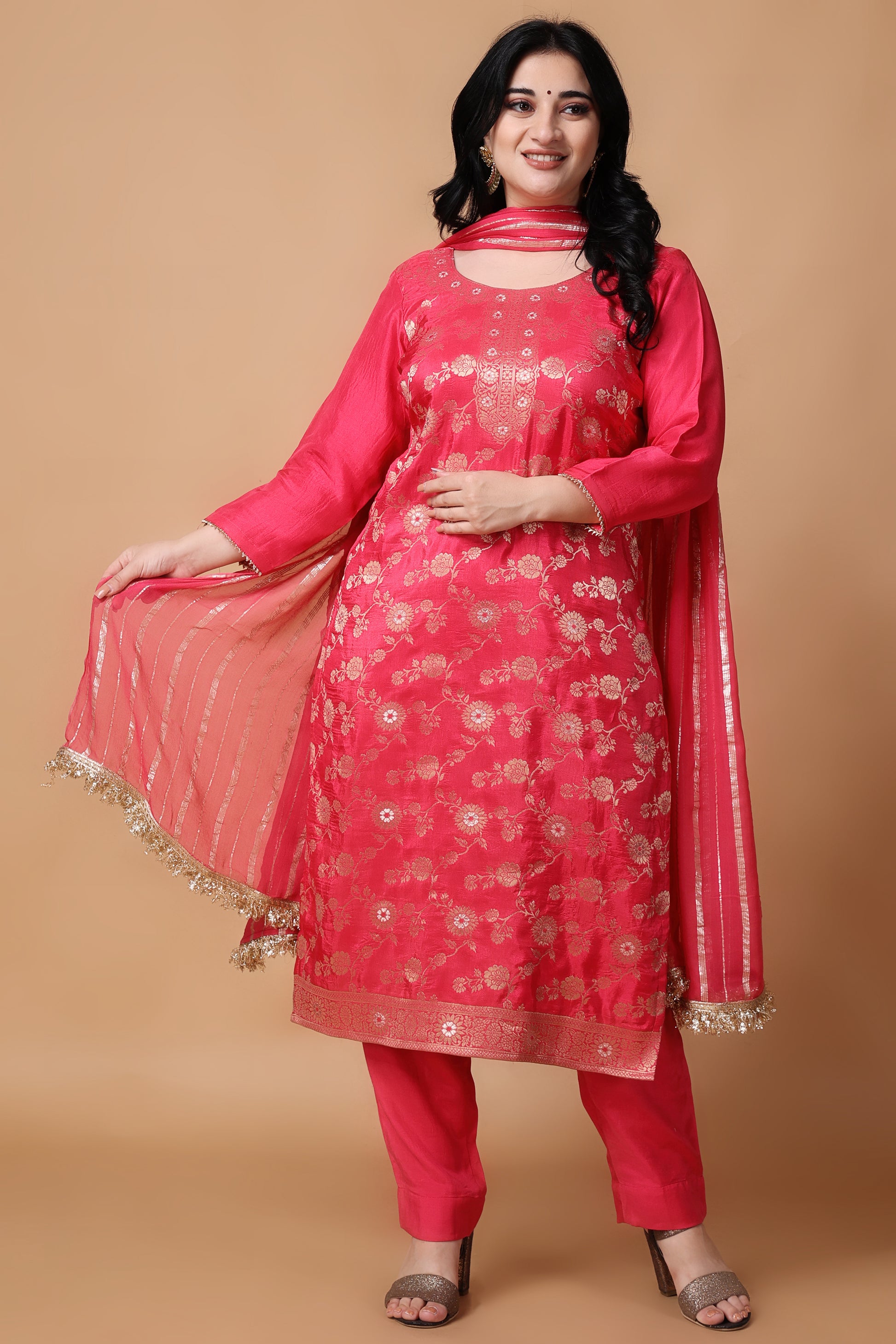 Whether you wear it for festive occasions, weddings or special events, our Tickle Me Pink Silk Suit Set is designed to make you feel like a true diva. This set is crafted from premium Silk fabric, the suit showcases intricate jacquard weave all over, adding a touch of sophistication and richness to the ensemble. The set features round neckline and quarter sleeves. Complete the set with a matching bottom and a dupatta.