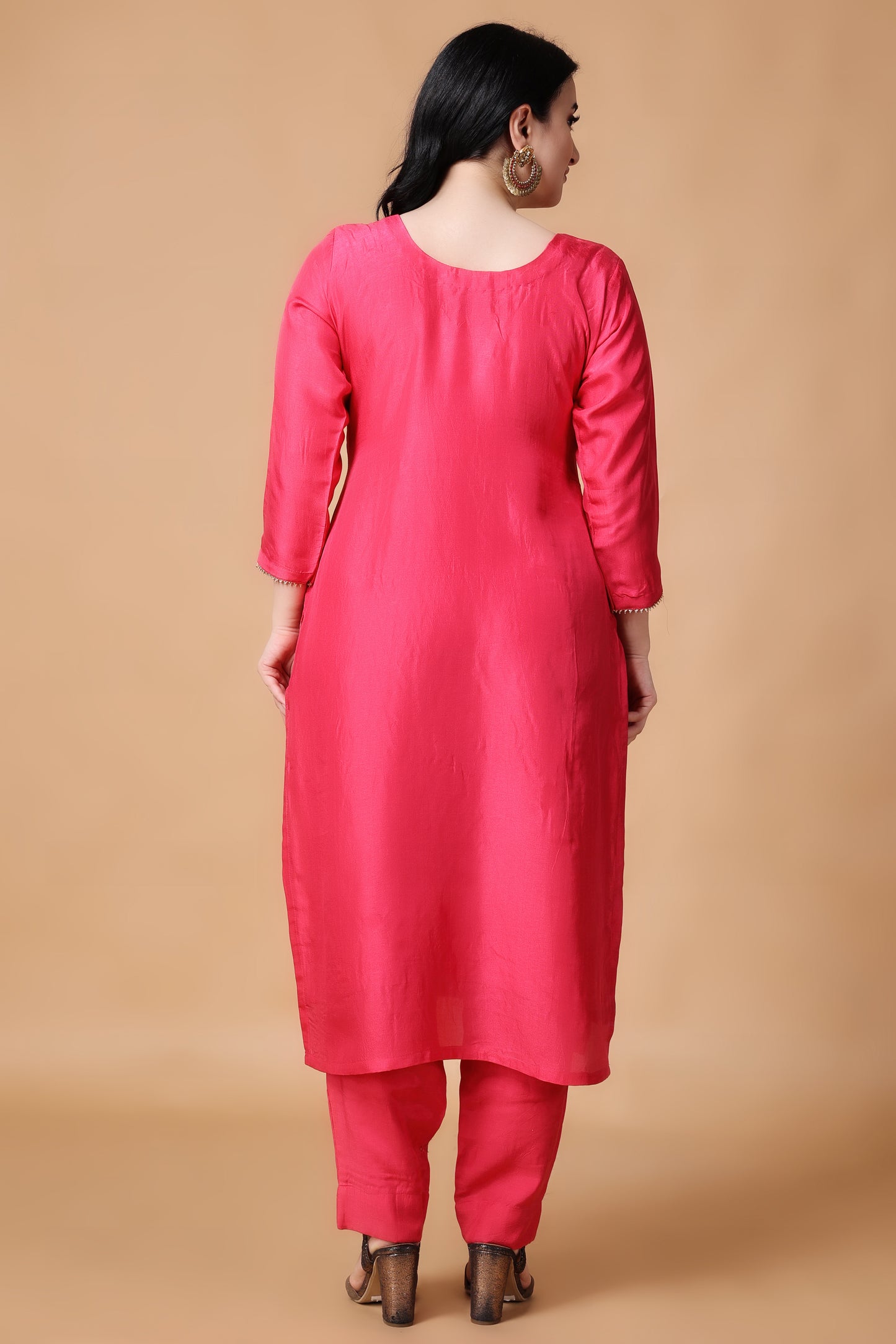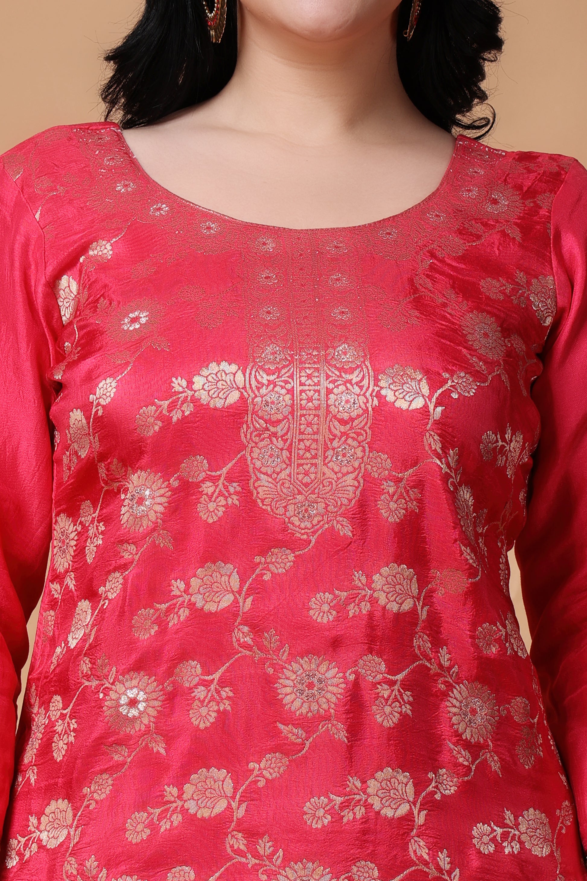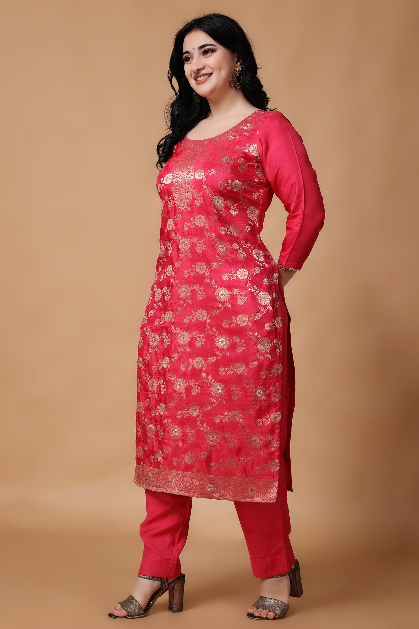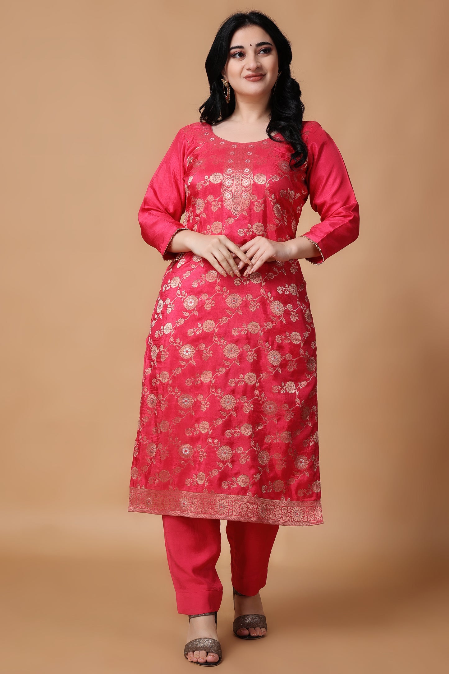 Whether you wear it for festive occasions, weddings or special events, our Tickle Me Pink Silk Suit Set is designed to make you feel like a true diva. This set is crafted from premium Silk fabric, the suit showcases intricate jacquard weave all over, adding a touch of sophistication and richness to the ensemble. The set features round neckline and quarter sleeves. Complete the set with a matching bottom and a dupatta.