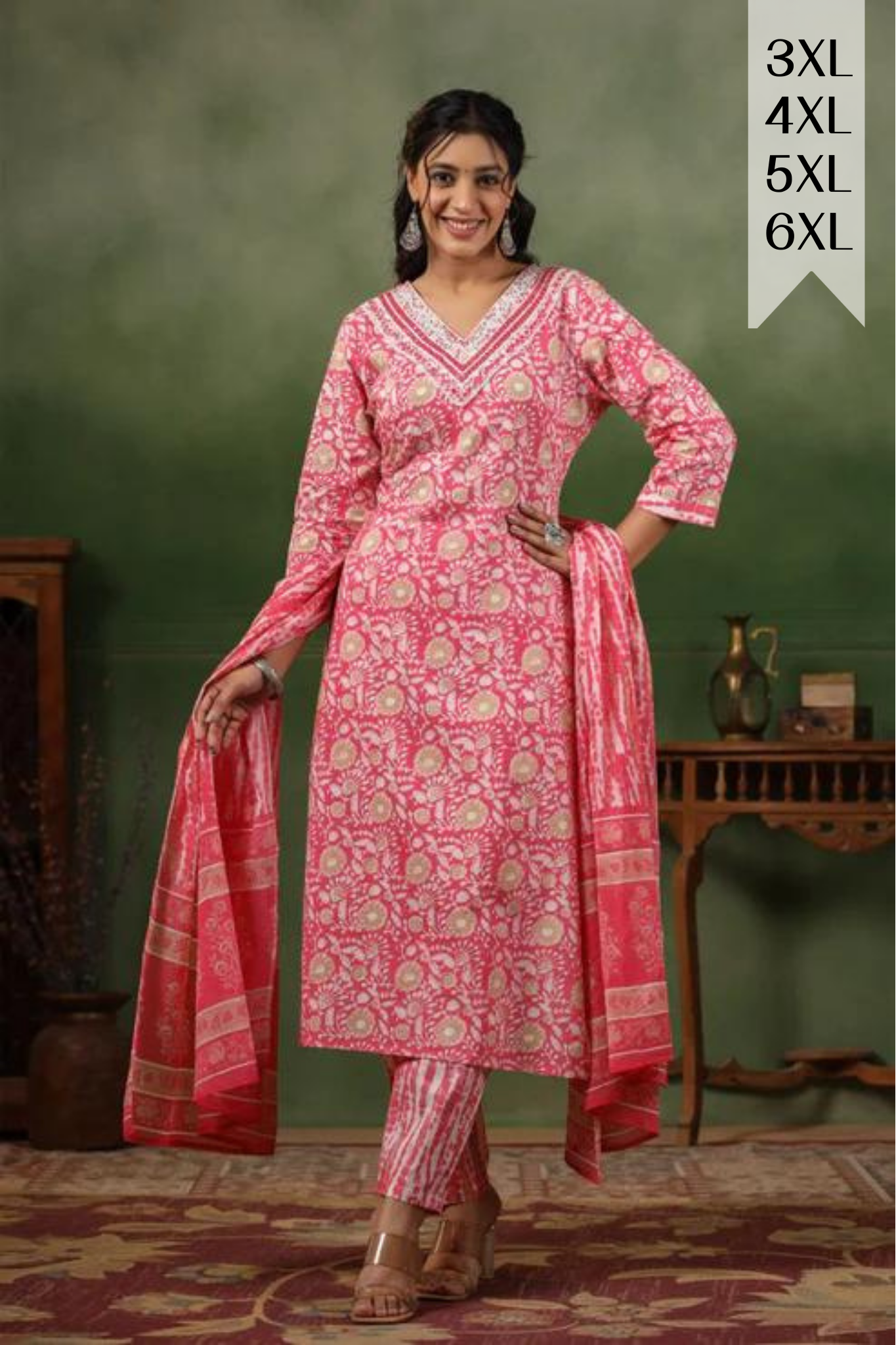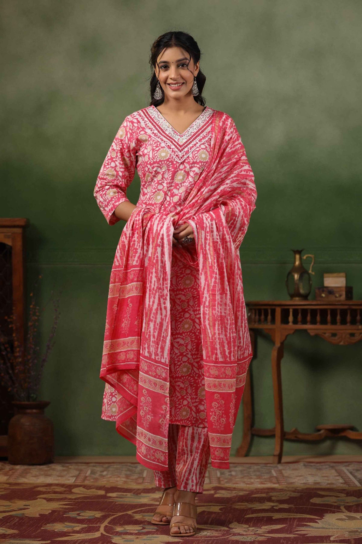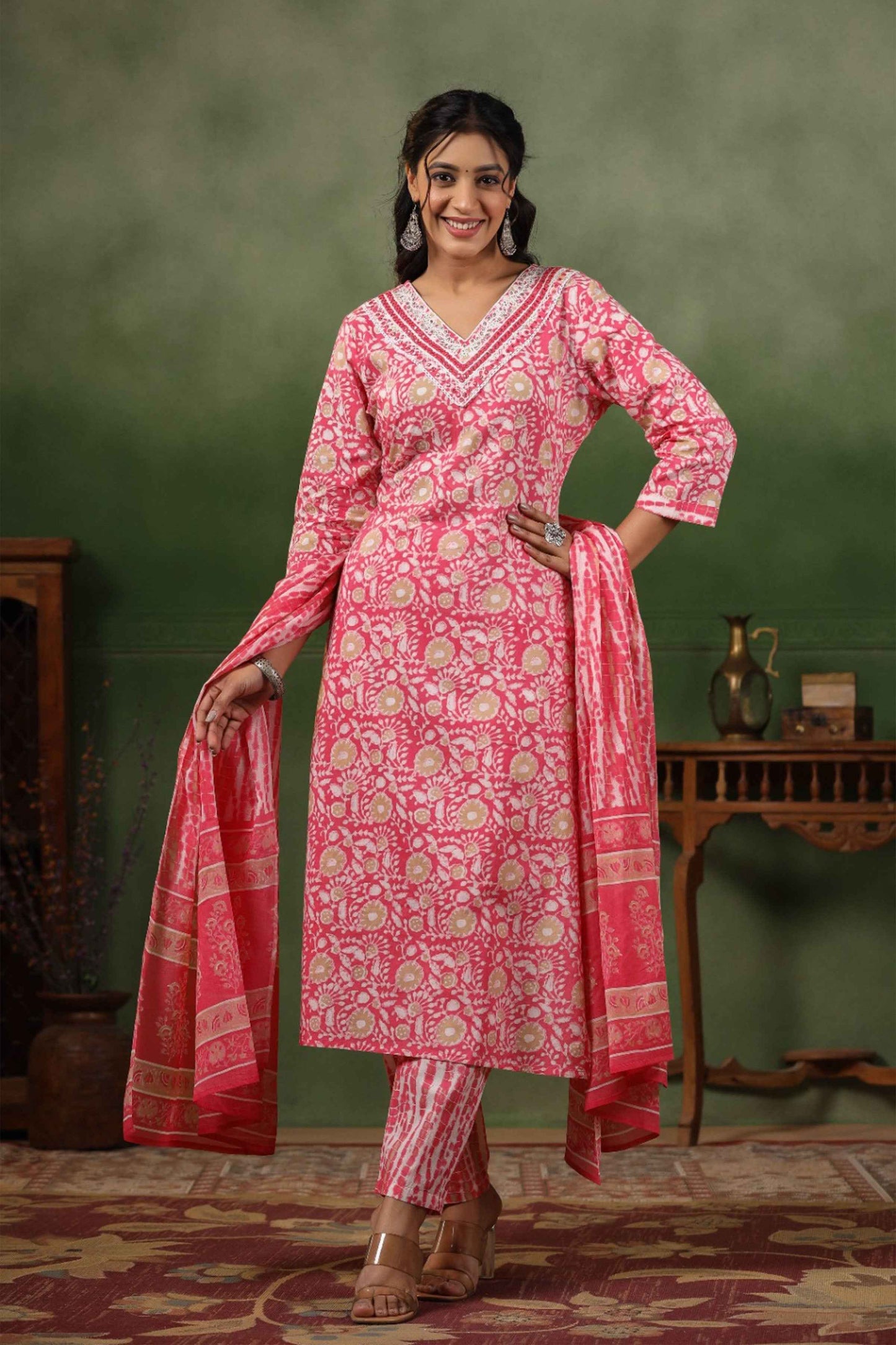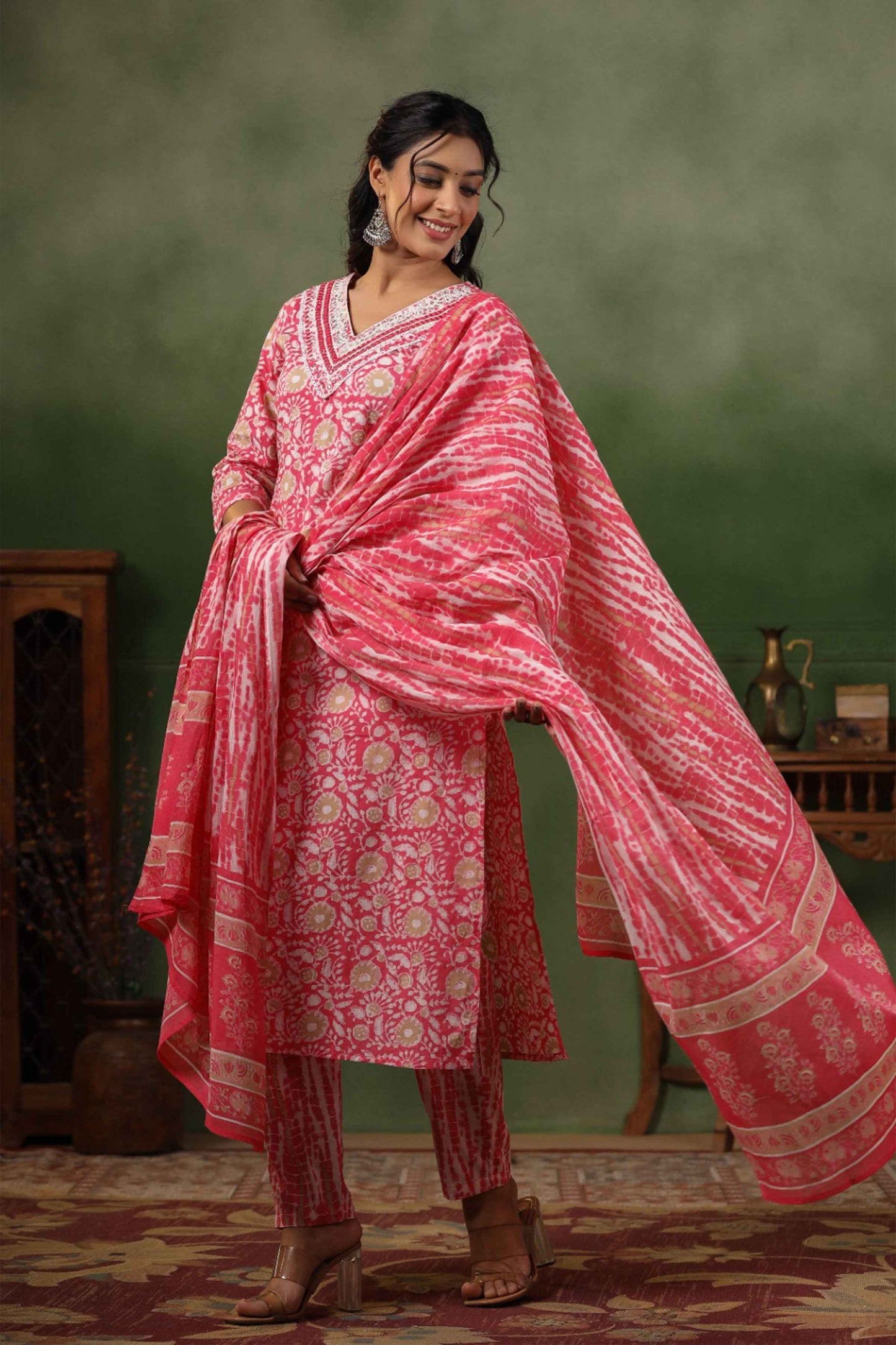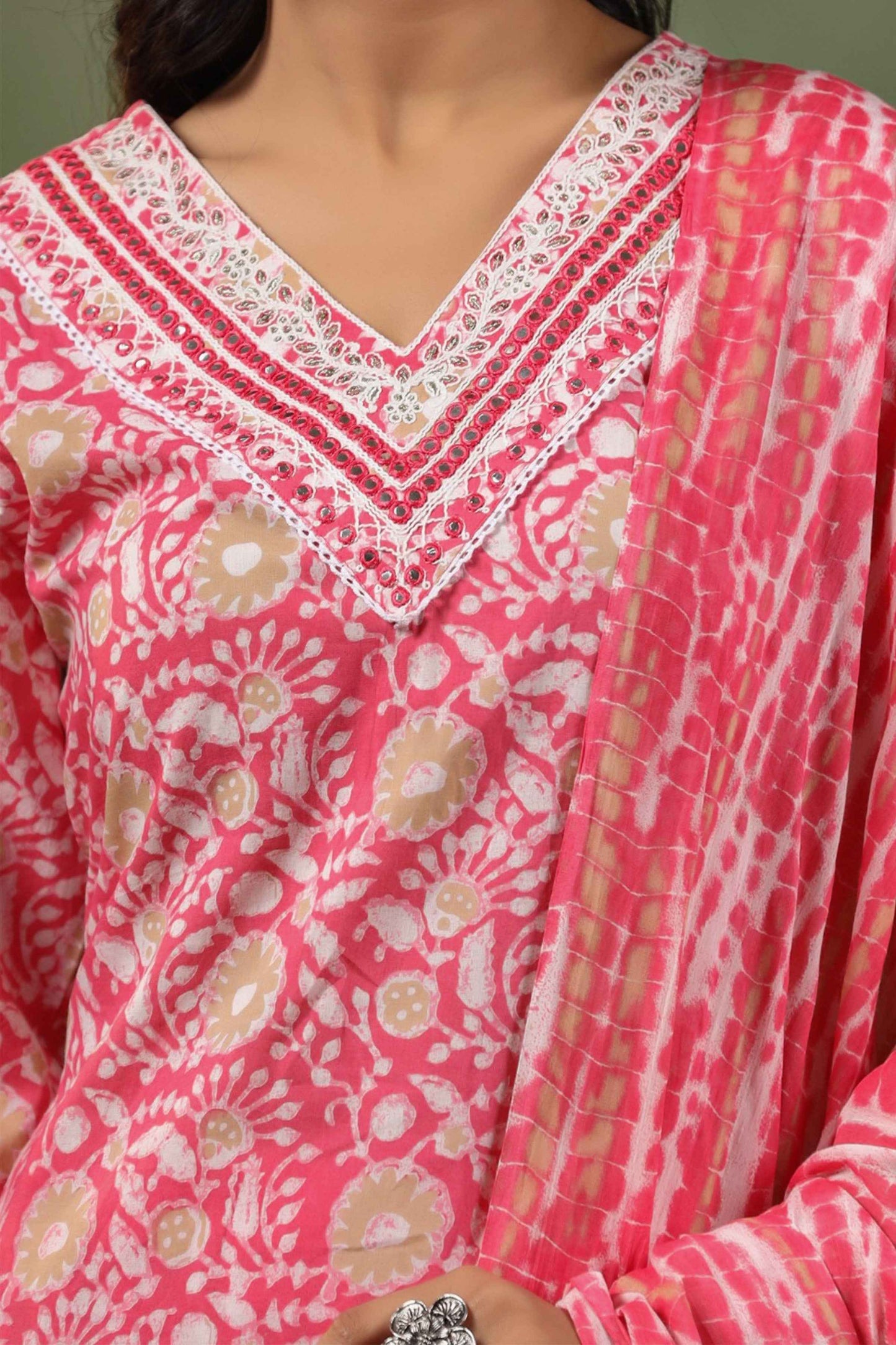Revibe your summer wardrobe with the Vibrant Pink Cotton Suit Set. Made from cotton fabric, it features a all-over floral print, a V-neckline with sequin, mirror, and lace detailing, complemented by quarter sleeves. It is paired with matching palazzo pants, and a printed dupatta for a vibrant and stylish summer look.