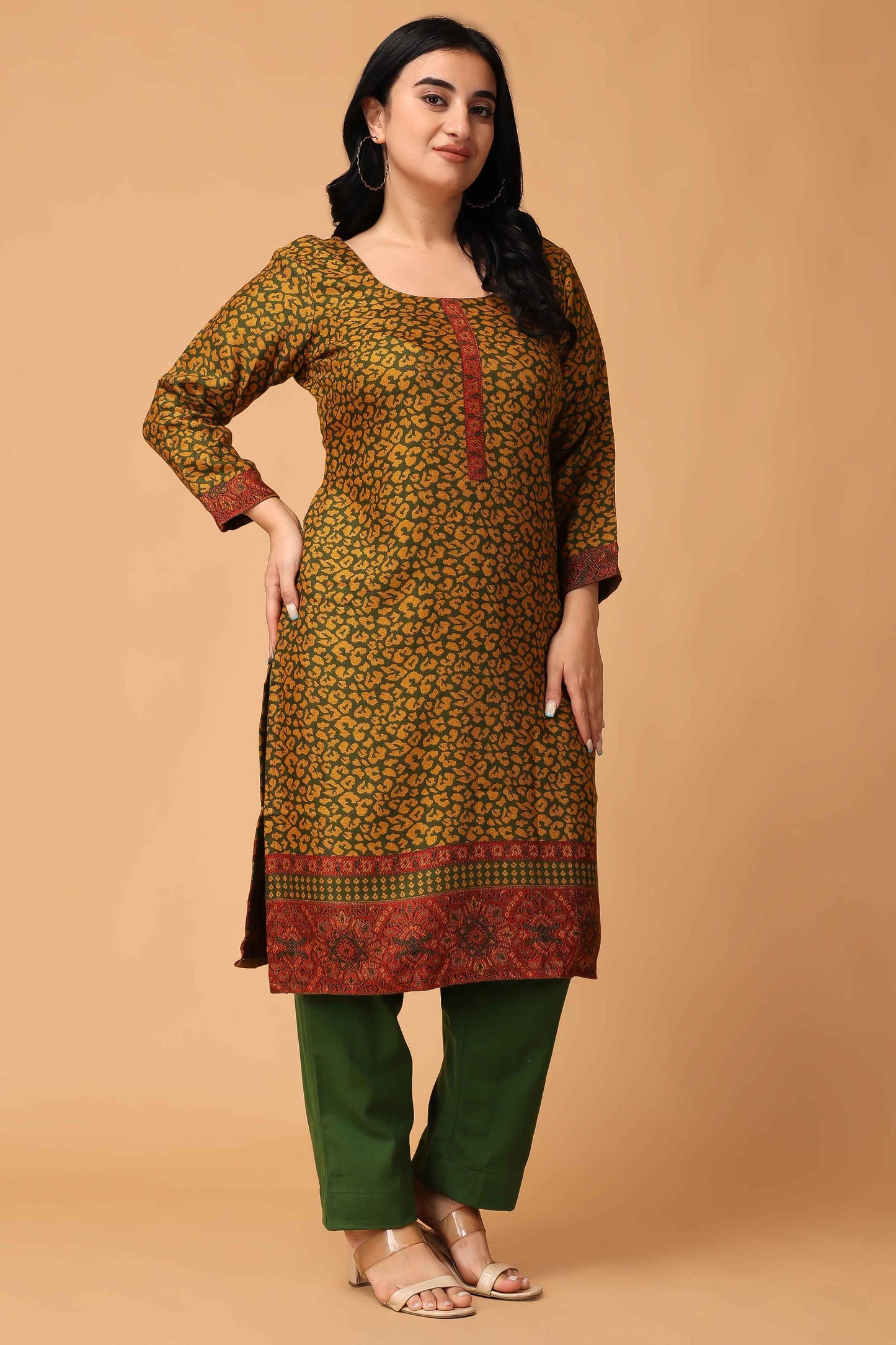 Introducing our Mustard Printed Woollen Kurta, a vibrant addition to your winter wardrobe. Crafted from the comfort of cashmilon fabric, this set features a charming print all over, accentuated by contrast detailing at the neckline, hemline and sleeves. Stay warm and fashion-forward with this versatile outfit.