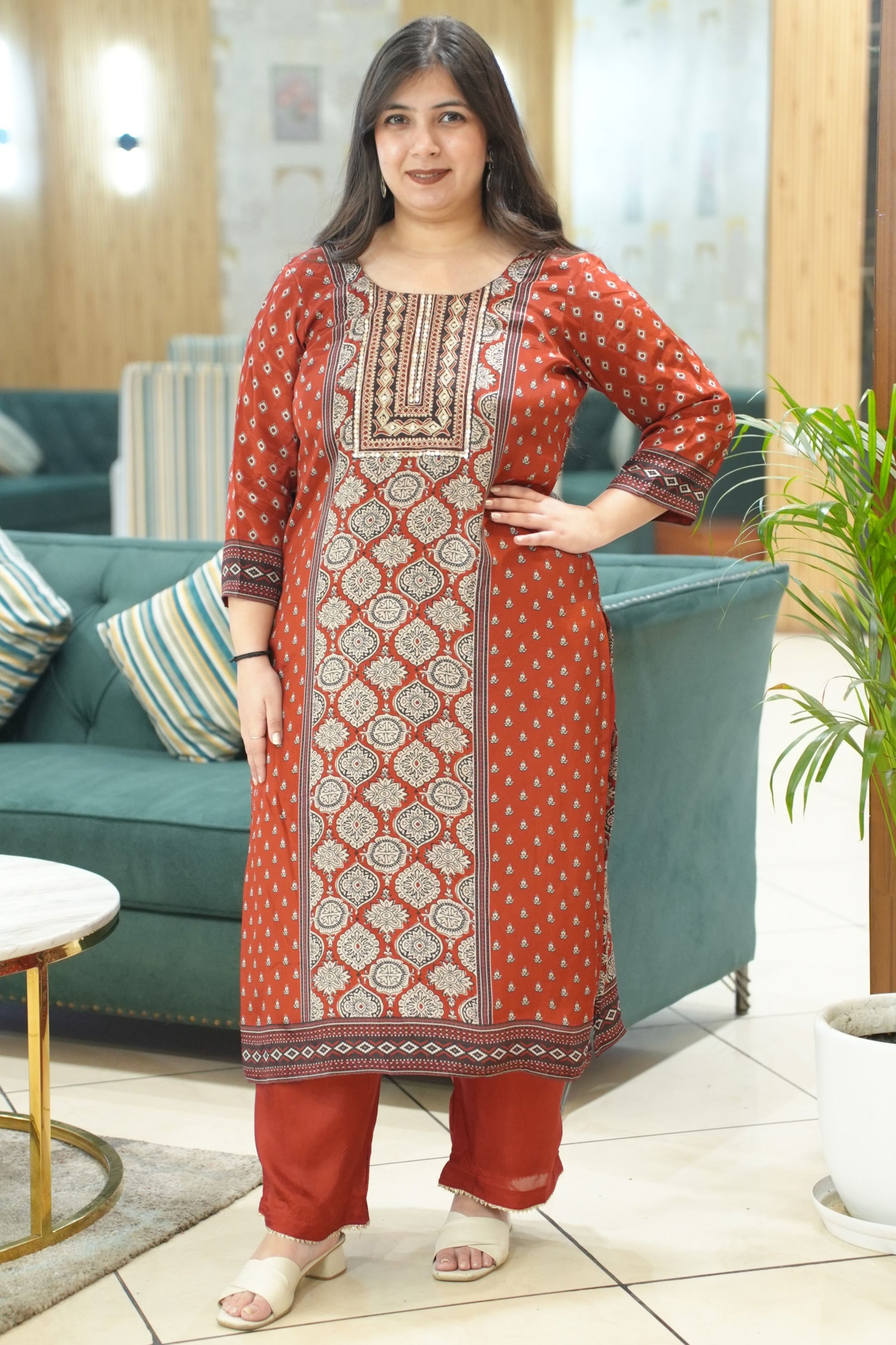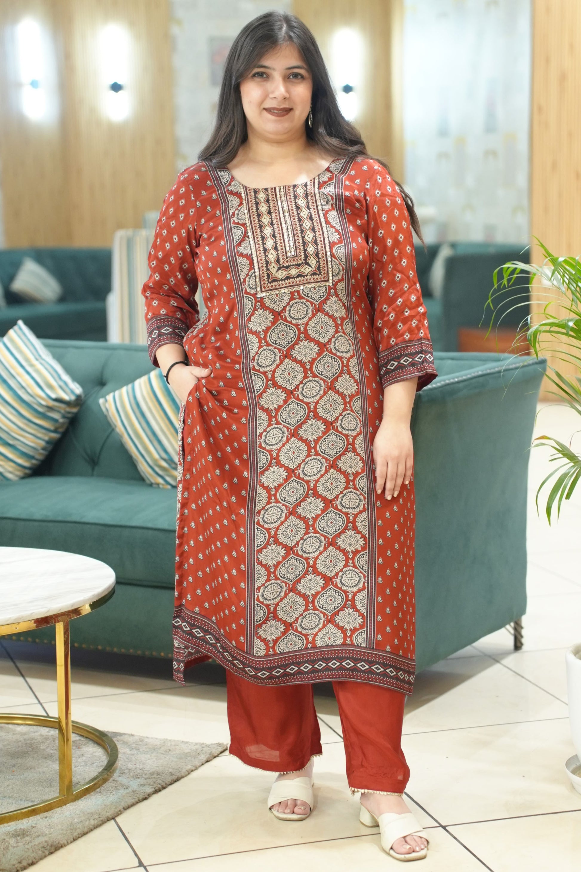 - Neckline featuring intricate Aari thread & subtle mirror work